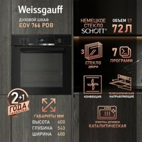 Класс энергопотребления А+ позволит вам еще раз убедиться в том, что Weissgauff способны создавать по-настоящему эффективные устройства, не расходующие при этом больше электричества, чем необходимо. Наслаждайтесь настоящими кулинарными шедеврами, приготовленными в нашем духовом шкафе, и при этом не тратьте лишние деньги на счета за электроэнергию - вот воплощение истинного немецкого подхода к созданию эффективной бытовой техники