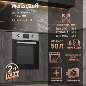 Объем 50 литров дает вам полную уверенность в том, что приобретая этот духовой шкаф, вы сможете разместить в нем сразу весь необходимый объем пищи, и даже профессионально работать на нескольких уровнях одновременно, порадовав себя и своих близких настоящим пиром, приготовленным в духовом шкафу Weissgauff на действительно ресторанном уровне.