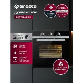 Встраиваемый духовой шкаф Gressel U6ES17000 — это инновационная модель, чьей уникальной конструктивной особенностью является верхнее расположение вентилятора конвекции. Благодаря этому решению, духовка превращается в полноценный аэрогриль, позволяя готовить блюда с аппетитной хрустящей корочкой практически без масла. При объёме 60 литров вы легко сможете запекать несколько блюд одновременно, добиваясь при этом идеального результата за счёт 6 режимов работы.