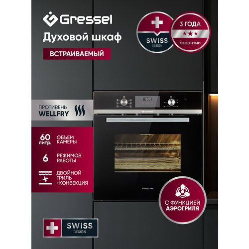Внутренняя камера покрыта эмалью лёгкой очистки, что упрощает уход за духовкой, а яркая подсветка и продуманные направляющие помогают контролировать процесс приготовления без лишнего открытия дверцы. При ширине 60 см модель отлично впишется в любой стандартный гарнитур, а благодаря 3-летней гарантии от Gressel вы можете быть уверены в её надёжности и долговечности.