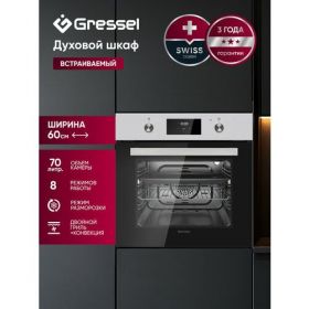 Духовой шкаф Gressel U6EM58110 предлагает внушительную вместимость 70 литров и широкий ассортимент режимов приготовления, что делает его идеальным выбором для современной кухни. С его помощью можно легко готовить большие объемы пищи или несколько блюд одновременно благодаря функциям двойного гриля, конвекции и специальному режиму разморозки.
