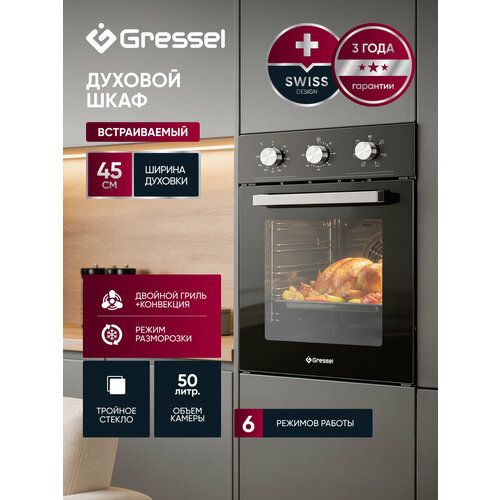 Компактный и вместительный: Духовой шкаф шириной 45 см и объемом 50 литров отлично подходит для небольших кухонь, оставаясь достаточно вместительным для приготовления разнообразных блюд.