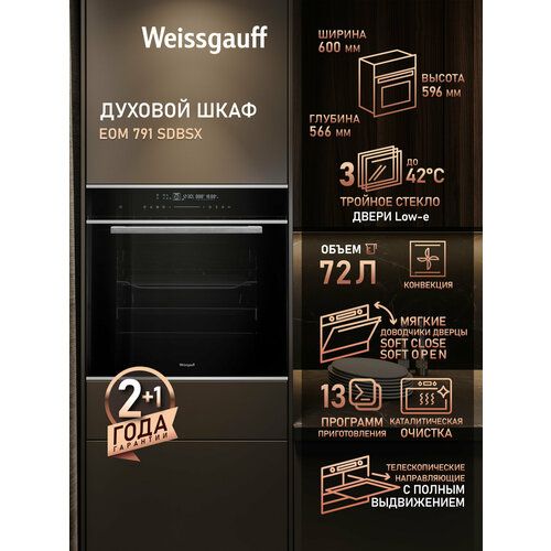Электрический встраиваемый духовой шкаф — крупная бытовая техника для кухни из серии Premium для самых требовательных пользователей. Объем 72 литра позволяет устроить настоящий пир для близких: вы сможете разместить мясо и гарнир одновременно на нескольких уровнях. Выбирайте любой из 13 функциональных режимов для приготовления по-настоящему вкусных блюд. Технология SMART MENU сама подберет необходимую температуру на выбранном вами режиме. Если захочется увеличить градус, вы сможете это сделать. Мягкие доводчики дверцы позволяют защитить вашу электродуховку от повреждений. Каталитическая очистка облегчит уход за встраиваемой электрической духовкой для выпечки. Тройное съемное стекло защитит вас и детей от ожогов при случайных прикосновениях: оно не нагревается до высоких температур, даже если духовая печь уже готовит пищу. Духовой шкаф имеет класс энергопотребления А+, что является свидетельством его высокой эффективности и экономичности. Сочетание продвинутых функций с учетом экологичности и экономии делает его не только удобным, но и ответственным выбором для современной кухни.
