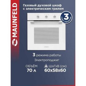 Духовой шкаф Maunfeld MOGS703W белый, газовая духовка, объём 70л, покрытие: эмаль легкой очистки, газовый гриль, программ духовки: 3, независимое управление, переключатели поворотные