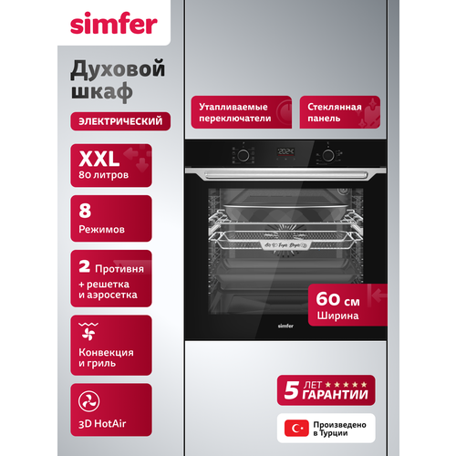 НАЙТИ ВЫГОДНЕЕ - Духовой шкаф электрический встраиваемый Simfer, 60см, 80л, 8 режимов, гриль, конвекция, таймер, 5 ЛЕТ гарантия