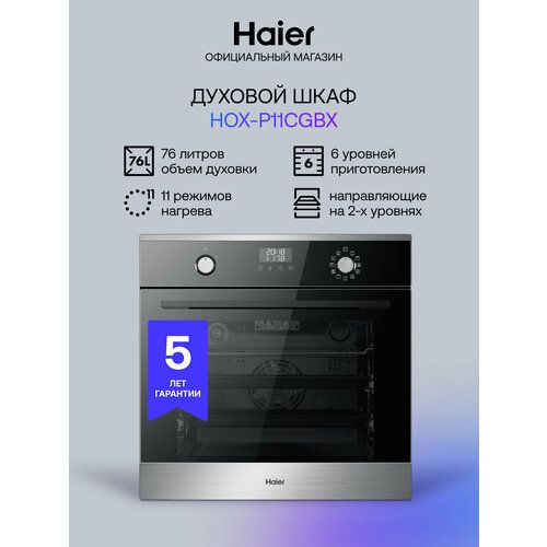 Электрический духовой шкаф Haier hox-p11cgbx – удачный выбор для большой семьи, в которой готовят много. Объём прибора 76 л, так что в него поместится и крупная птица, и большой окорок. Одновременно можно использовать до шести уровней, причём на двух расположены телескопические направляющие. Если вам понадобится, например, полить жаркое соусом, не придётся одно рукой придерживать противни. К вашим услугам 11 режимов. Кроме традиционных комбинаций работы верхнего и нижнего нагревательных элементов, гриля и конвекции, есть циклы «Размораживание» и «Расстойка теста». Первый позволит сэкономить время, второй – получить пышную дрожжевую выпечку. У этой модели удобное управление: утапливаемые поворотные регуляторы и электронный сенсорный программатор, с помощью которого устанавливается таймер. Встроенный цифровой дисплей отображает актуальные настройки. Благодаря тройному остеклению снаружи духовка не становится горячей, к ней можно спокойно прикасаться, не опасаясь ожога. Доводчик обеспечит плавное закрывание. Для простоты ухода дверца снимается – вы без труда её помоете. Очистка внутренних стенок устройства тоже не доставит хлопот: каталитическая эмаль растворяет загрязнения непосредственно в процессе работы прибора.