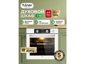 Встраиваемый духовой шкаф Ardo BO810EAW2, XXL, 10 режимов, функция пара, объем 76 л, с Грилем и Конвекцией, функция Аэрогриль, утапливаемые переключатели, тройное остекление дверцы, 60 см 4607280280