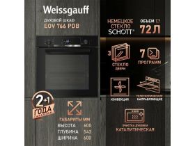 Духовой шкаф Weissgauff EOV 766 PDB конвекция, 3 года гарантии, 60 см ширина, 72 литра, утапливаемые рукоятки, 7 режимов, кольцевой нагревательный элемент, телескопические направляющие, каталитическая очистка, двойное стекло дверцы, сенсорное управление 1