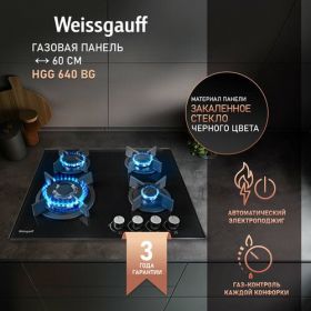 Встраиваемая независимая газовая панель Weissgauff шириной 60 см, исполненная в закалённом чёрном стекле - это стильное и компактное решение для вашей кухни