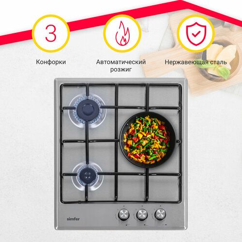 Газовая варочная панель 45см Simfer H45V30M470 это стильное и функциональное решение для вашей кухни. Панель оснащена тремя конфорками различных размеров и мощностей, позволяя вам выбирать оптимальный режим приготовления для различных блюд. С помощью автоматического розжига вы сможете легко и безопасно зажечь плиту.
