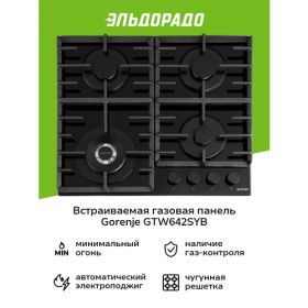 НАЙТИ ВЫГОДНЕЕ - Варочная панель Gorenje GTW642SYB, газовая, 4 конфорки, чугун, черная, 60x52 см