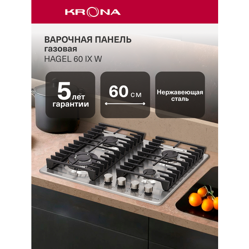 Газовая варочная панель HAGEL шириной встраивания 60 см выполнена из нержавеющей стали. Модель отлично впишется в дизайны кухонь выполненных в современном стиле. Поверхность оснащена всеми необходимыми функциями безопасности и удобства: автоматический электроподжиг, "Газ-контроль", экспресс-конфорка с тройным пламенем, регуляторы из негорючего полимера. Для комфортного приготовления модель HAGEL предусматривает две устойчивые чугунные решетки, которые отличаются высокой прочностью и надежностью.