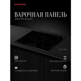Варочная поверхность Kuppersberg ECS 702 — это электрическая варочная панель, изготовленная из прочной стеклокерамики KANGER. Она имеет стильный и элегантный внешний вид, который подойдёт для современного кухонного интерьера.