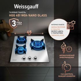 НАЙТИ ВЫГОДНЕЕ - Варочная панель Weissgauff HGG 451 WGh Nano Glass wok-конфорка, 3 года гарантии, 45 см ширина, закаленное стекло с покрытием NanoGlass, Автоматический электроподжиг, Газ-контроль, Решетки из чугуна, Рукоятки Hi-Tech