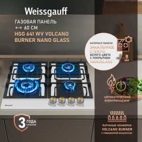 Встраиваемая независимая газовая панель Weissgauff шириной 60 см, оснащенная инновационной технологией конфорок Volcano Burner, бакелитовыми рукоятками, автоматическим электроподжигом и газ-контролем, исполненная в закалённом белом стекле - это по-настоящему эффективное и красивое решение для вашей кухни