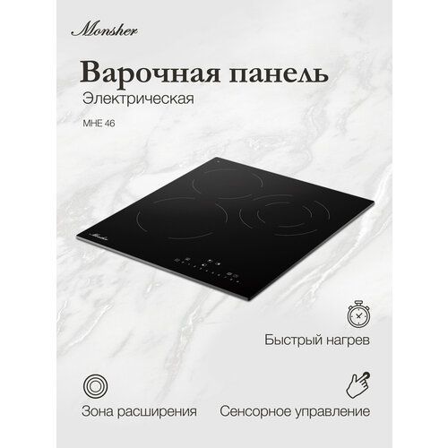 MONSHER Hi-Light High-Tech 45 см - это компактная, функциональная и современная электрическая варочная поверхность, которая предлагает быстрый нагрев, точную регулировку мощности, безопасность и удобное управление. Она станет отличным выбором для небольших кухонь и для тех, кто ценит сочетание стиля и функциональности.