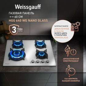 Встраиваемая независимая газовая панель Weissgauff шириной 60 см, исполненная в закалённом белом стекле - это стильное и компактное решение для вашей кухни