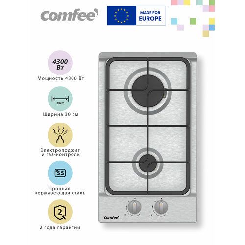 НАЙТИ ВЫГОДНЕЕ - Газовая варочная панель Comfee CGH301X, 2 конфорки домино, ширина 30 см, нержавеющая сталь, электроподжиг, газ-контроль