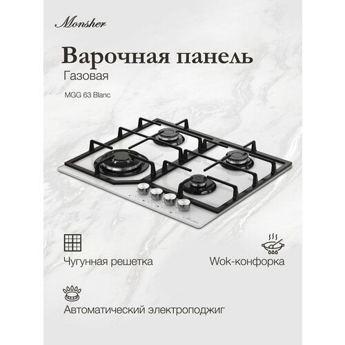 Газовая варочная панель Monsher MGG 63 Blanc из коллекции High-Tech — современная модель, которую отличает стильный лаконичный дизайн, удобство и безопасность использования. Предусмотрена система «Газ-контроль»: в случае угасания пламени встроенные предохранители моментально прервут подачу газа и предотвратят утечку.