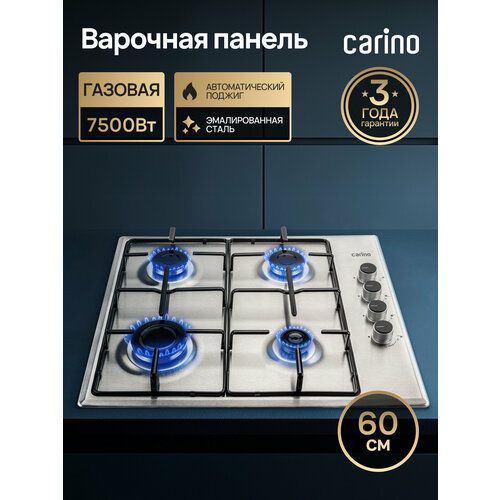 НАЙТИ ВЫГОДНЕЕ - Газовая варочная панель CARINO CH60Q40M411 60 см, газ-контроль, нержавеющая сталь, автоматический розжиг, эмалированные решетки