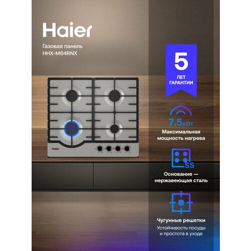 Газовая варочная панель Haier HHX-M64RNX с основанием из высококачественной нержавеющей стали, выступающей над уровнем столешницы всего на несколько миллиметров, смотрится лаконично и стильно. В каждую конфорку интегрирован электроподжиг — пламя легко зажигается без спичек. А если вдруг оно случайно погаснет, сработает функция «газ-контроль» — подача газа будет автоматически перекрыта. Чугунные решётки обеспечивают устойчивость посуды во время готовки, они съёмные — это облегчает уход. Поворотные регуляторы управления конфорками, изготовленные из металла, вынесены в переднюю часть панели — для максимального удобства пользователя. Haier HHX-M64RNX — стильная, удобная, безопасная и практичная варочная панель для вашей кухни.