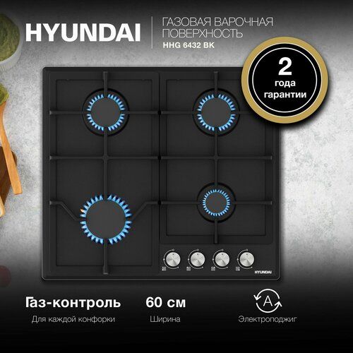 Газовая варочная поверхность Hyundai HHG 6432 BK черный, независимая установка, материал поверхности эмаль, количество конфорок: 4шт.