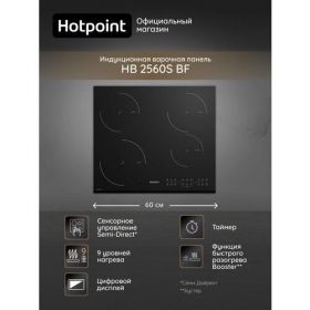 Индукционная варочная панель Hotpoint HB 2560S BF — безрамочная модель со скошенным передним краем. Используйте сенсорное управление, чтобы легкими касаниями включать и выключать панель, переключаться между 9 уровнями нагрева, а также использовать дополнительные опции.