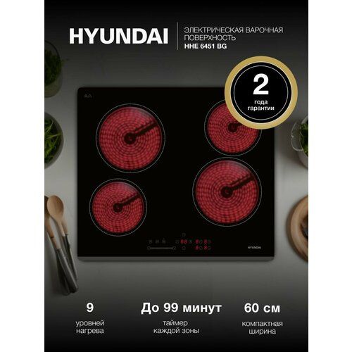 Встраиваемая электрическая варочная панель Hyundai HHE 6451 BG снабжена рядом полезных опций, делающих её эксплуатацию безопасной и комфортной. 4 отдельные зоны нагрева общей мощностью 6000 Вт позволяют готовить одновременно несколько блюд.