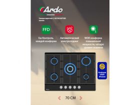 Газовая варочная панель Ardo 70 см, черное закаленное стекло, WOK-конфорка, чугунные решетки, газ-контроль 4378672144