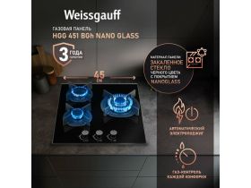 Варочная панель Weissgauff HGG 451 BGh Nano Glass wok-конфорка, 3 года гарантии, 45 см ширина, Чёрное закаленное стекло с покрытием NanoGlass, Автоматический электроподжиг, газ-контроль, решетки из чугуна, Рукоятки Hi-Tech 103536989084
