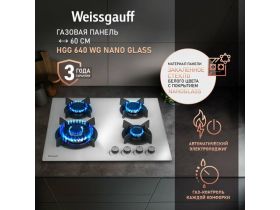 Варочная панель Weissgauff HGG 640 WG Nano Glass 3 года гарантии, Ширина 60 см, Стекло легкой очистки NanoGlass, WOK-конфорка, Автоматический электроподжиг, Газ-контроль, Решетки из чугуна, Рукоятки Hi-Tech 103529463359