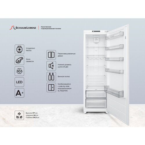 Климатический класс: BGT/SN (10 °C-43°C) ● Электронное управление ● LED подсветка ● Класс энергопотребления: А+ ● Уровень шума: 41дБ ● Материал полок и ящиков: закаленное стекло ● Cold Air Flow ● Винная полка ● регулировка уровня влажности ● 5 полок на двери, 2 выдвижных ящика ● Объём (брутто/нетто): 303/300 л ● Габариты (ШxГxВ), см: 54x54,5x177 Комбинируется со встраиваемым морозильником Schaub Lorenz SL FE227WE, образуя холодильно-морозильный шкаф по типу Side-by-side.