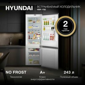 Hyundai HBR 1782 – это вместительный встраиваемый холодильник, полезный объём которого составляет 243 литра, то есть его свободного пространства хватит для хранения пищи на целую семью. Прибор оснащён двумя камерами – холодильной (сверху) и морозильной (снизу). Оба отделения устройства эргономично обустроены. Три полки из закаленного стекла в верхней части можно переставлять для своего удобства, для напитков присутствует отдельная зона в двери, а морозилка разделена на три ящика. Причём верхний в ней легко выдвигается и служит для быстрого доступа к продуктам.