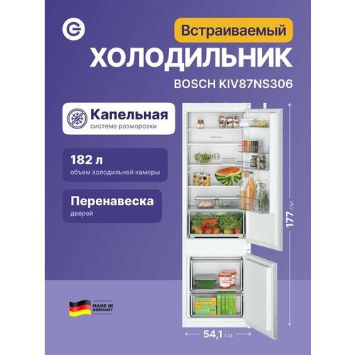 Холодильник BOSCH KIV87NS306 - это встраиваемая двухкамерная модель с нижним расположением морозильной камеры. Общий объём составляет 270 литров, из которых 200 приходится на холодильную камеру и 70 на морозильную. Управление осуществляется при помощи электронной системы и кнопок на передней панели. Внутри холодильной камеры расположены 5 полок, 4 из которых регулируются по высоте. Также имеется специальный выдвижной контейнер MultiBox для хранения овощей и фруктов. Морозильное отделение оснащено системой LowFrost и функцией суперзамораживания SuperFreezing.