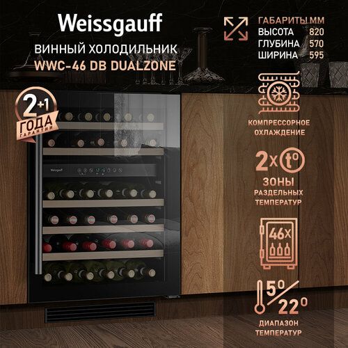 НАЙТИ ВЫГОДНЕЕ - Встраиваемый винный холодильник Weissgauff WWC-46 DB DualZone компрессорный холодильник для вина, две зоны, 46 бутылок, 3 года гарантии