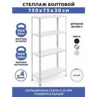 Стеллажи металлические болтовые Gastrorag GR-005-2 размером 150х75х30 см – это универсальная 4-ярусная система хранения различных предметов для гаража и сада, кладовой, кладовки и подсобки, балкона и лоджии, металлическая мебель в стиле лофт для квартиры, дома, дачи и офиса. Они также подойдут в качестве больших торговых или складских стеллажей для магазина. Стеллаж лофт можно использовать в качестве перегородки для зонирования пространства гостиной, спальни и гардеробной, металлического органайзера, напольной полки для хранения вещей, инструментов, домашних заготовок и консервации, подставки для обуви в прихожую, открытого шкафа для одежды, книг и игрушек, кухонного стеллажа для посуды или полки для микроволновки на кухню. В садоводстве он пригодится в качестве стеллажа под рассаду, этажерки для комнатных цветов и растений. Ему найдется применение и в качестве офисной мебели для хранения папок с документами. Железный окрашенный стеллаж поставляется в разобранном виде. Стеллаж трансформер укомплектован стойками высотой 150 см, которые состоят из двух частей. Вы можете собрать как один стеллаж высотой 150 см с 4 полками, так и 2 стеллажа высотой 75 см с 2 полками. Полки и стойки изготовлены из стали с порошково-полимерным покрытием, которое защищает от коррозии и позволяет использовать этажерку в помещениях с повышенной влажностью воздуха, например, в ванной комнате. Открытый напольный стеллаж легко собирается при помощи входящих в комплект болтов и гаек. Края полок острые, поэтому при сборке следует соблюдать осторожность и пользоваться хозяйственными перчатками. Завальцованные края металлических полок и стоек, а также восемь металлических уголков обеспечивают дополнительную жесткость конструкции и безопасность в эксплуатации. Пластиковые подпятники предохраняют пол от повреждений. Толщина металла составляет 0.35 мм. Этого достаточно, чтобы обеспечить допустимую максимальную нагрузку на полку - 30 кг, на весь стеллаж - 120 кг. Длина полочки 75 см, ширина 30 см. Высота полок регулируется с шагом 25 мм. В целях обеспечения устойчивости рекомендуется ставить стеллаж вплотную к стене и дополнительно крепить его к стене.