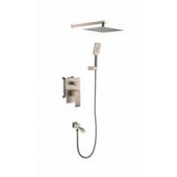 Смеситель для ванны и душа встраиваемый в стену с поворотным изливом с верхним душем из нержавеющей стали с силиконовыми вставками, благодаря которым не портиться верхний душ от известкового налета, что увеличивает срок службы изделия. Смеситель можно установить на любой высоте.