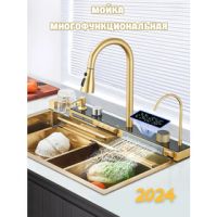 В комплект мойки входят разделочная доска из натурального дерева, треугольный коландер, чаша для разморозки, ринзер, смеситель с гибким изливом и каскадным водопадом с терморегулятором, сифон, гибкая подводка.